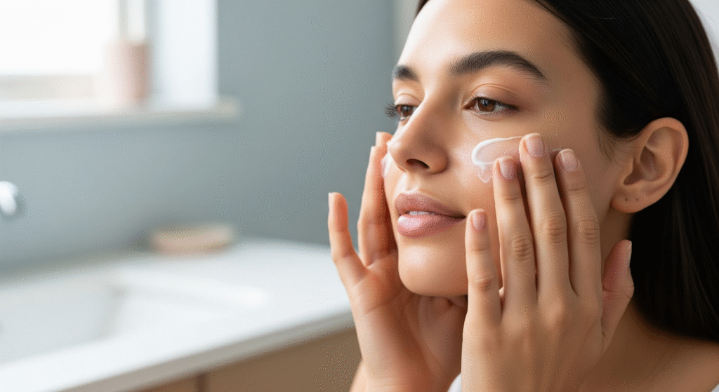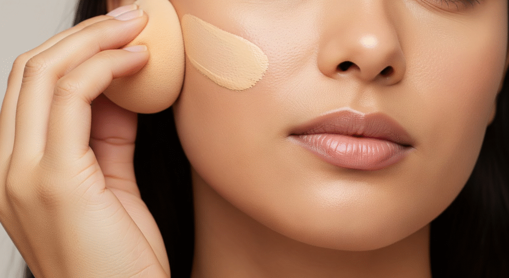 Choose a lightweight foundation or skin tint that matches your undertone, then apply with a damp sponge. Add concealer only where needed, then lightly set with translucent powder.