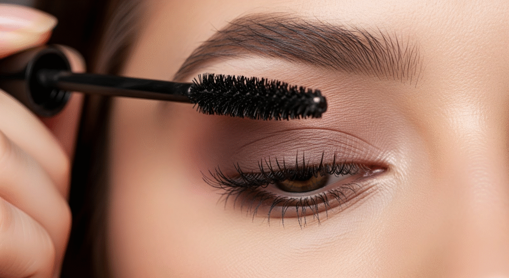 Apply a neutral matte shadow (taupe, beige, or soft brown) for dimension. Curl lashes and swipe on a lengthening mascara.