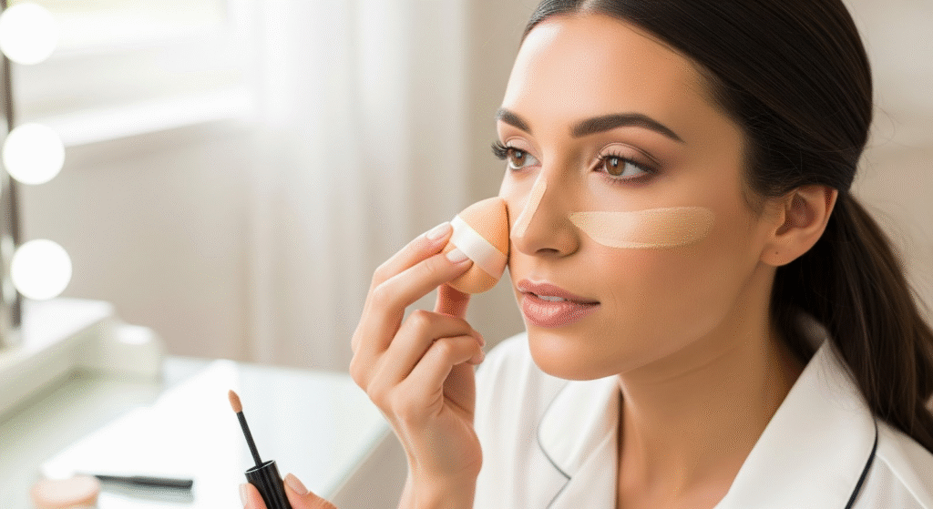 Apply foundation in thin layers, blending outward with a damp sponge. Then, spot-correct with concealer: under eyes, around the nose, and on any redness. For extra staying power, use a setting powder to lock everything in place.