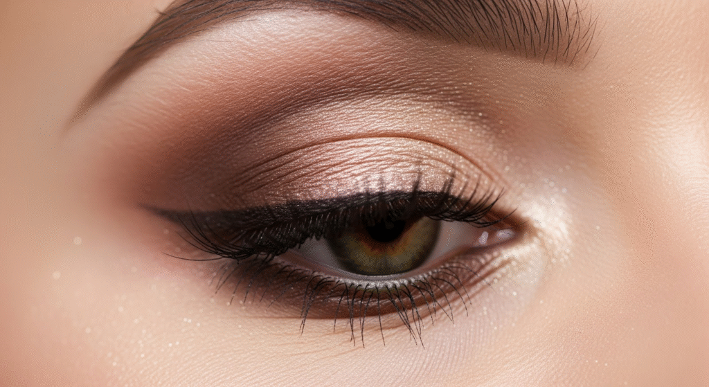 - Soft glam bride: Champagne shimmer on the lid, taupe in the crease, soft brown liner.