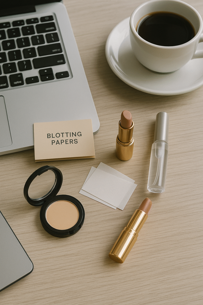 - Desk essentials: blotting papers, mini powder, neutral lipstick, and a travel-size setting spray.
