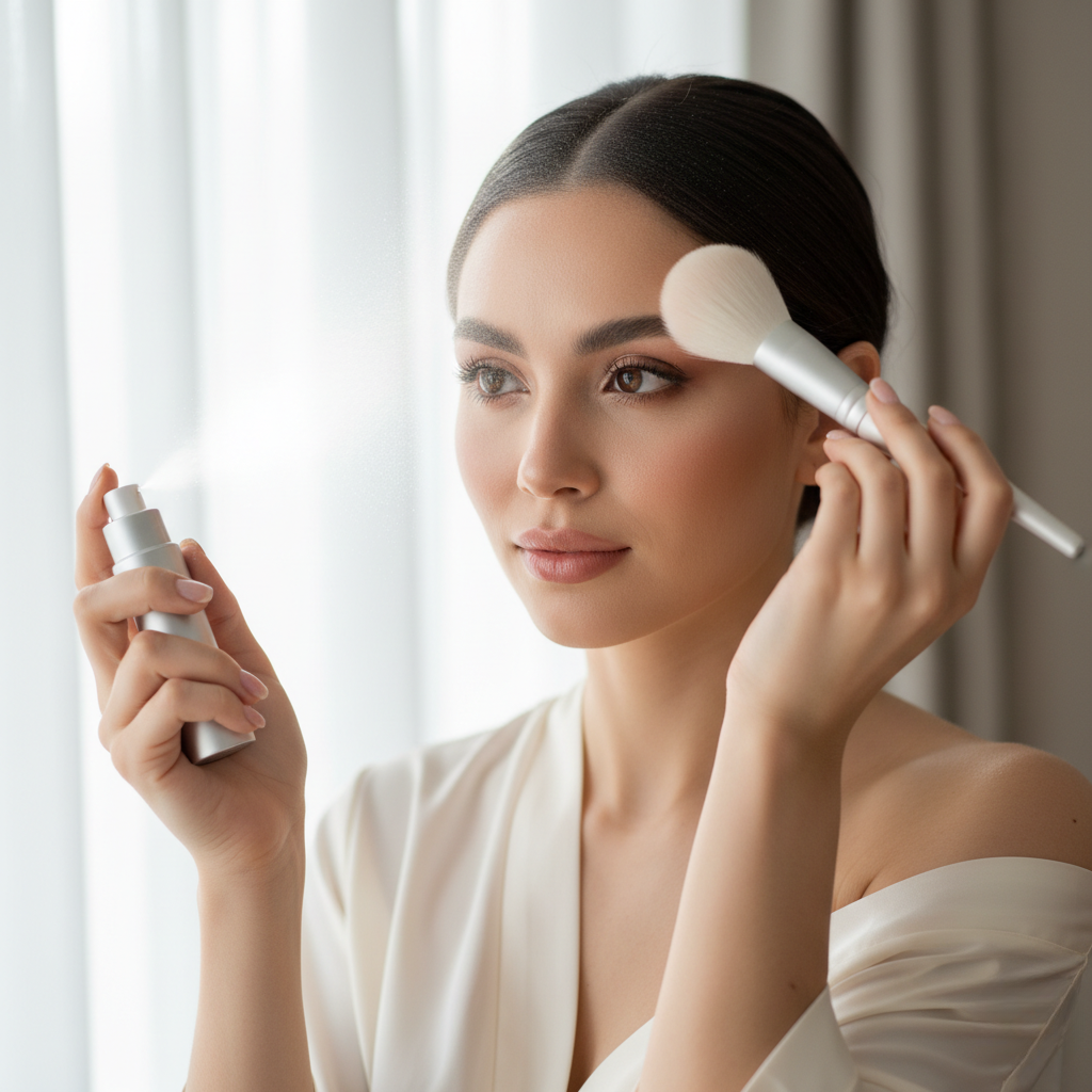 - To set everything in place, hold a setting spray about a foot from your face and mist two or three times. Let it air dry naturally.